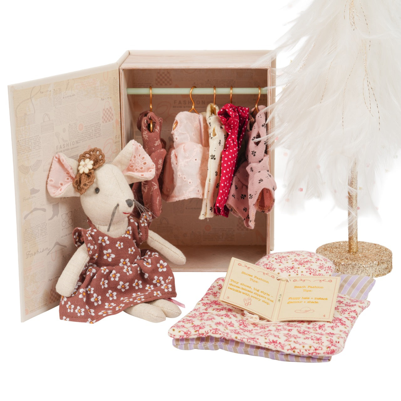 A soft plush mouse with a wardrobe-ready set of dresses, the Mouselle doll is charmingly detailed and ready for imaginative play. The doll wears a floral dress and comes with additional tiny outfits hanging in a miniature closet for mix-and-match fun. LevLovs crafted this piece with textile fabrics and embroidered facial features for a gentle, heirloom feel. Perfect for role-play and display, the Mouselle doll encourages storytelling and fine-motor dressing skills.
